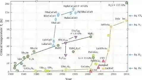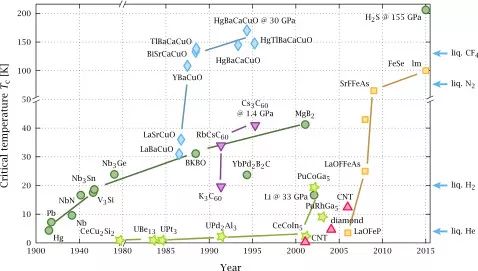 ○ 1900年-2015年超导体的发现历史。绿色圆形:金属超导体;蓝色菱形:铜基高温超导体;橙色方块:铁基超导体。2015年,科学家发现,H₂S在155 GPa的超高压下,当温度降低到203 K(-70 °C)时转变为超导态,这是目前所知的转变温度最高的超导体。| 图片来源:Wikipedia
