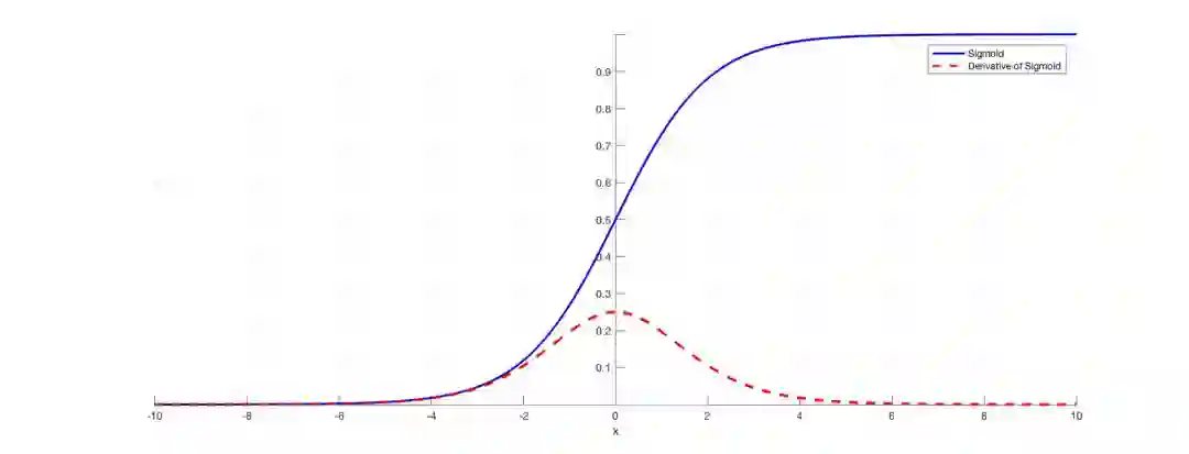 例如,图一是sigmoid函数及其导数。注意当sigmoid函数的输入变大或变小时(当|x|),导数如何接近零。