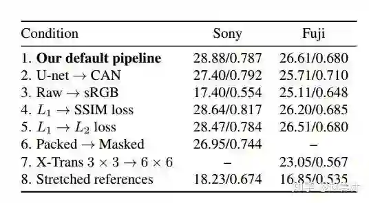 虽然,数据集中的参考图像仍可能存在一些噪音,但感知质量足够高。我们目的是为了在光线不足的条件下产生在感知良好的图像,而不是彻底删除图像中所有噪音或最大化图像对比度。因此,这种参考图像的存在不会影响我们的方法评估。