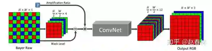 对于输入的raw数据,先打包成4个通道,然后对每个通道做一次2两倍的下采样。然后将放大因子作为一个输入,送进网络(这里的放大因子指的是输入图片和金标准之间曝光时间的倍数)。输出是一个12通道的feature map,最后转化为sRGB图像。