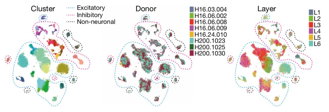 研究者将所测序的15928个细胞分为了75个细胞类型,其中24个类型属于兴奋性神经元,45个类型属于抑制性神经元,其余6个类型属于非神经元细胞。
