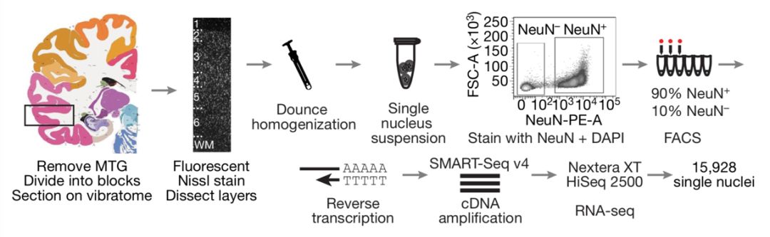 人脑细胞单核RNA测序流程图,图片来自 Nature