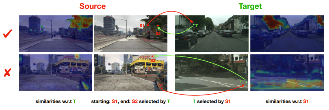 如上图所示,对于随机采样的 source 和 target 图片,我们首先建立他们像素级别的关联。我们利用像素级别的循环一致性 (pixel-level cycle consistency) 来建立这种关联。具体来说,对于任一 source 图片中的像素 S1,我们在 target 图片中选择与之相似度最高的像素 T。然后,对于选择的 target 像素 T,我们反过来选择与之最接近的 source 图片中的像素 S2。如果 S1 和 S2 属于同一个类别,我们则建立 S1--> T --> S2 的关联,否则,关联不成立。