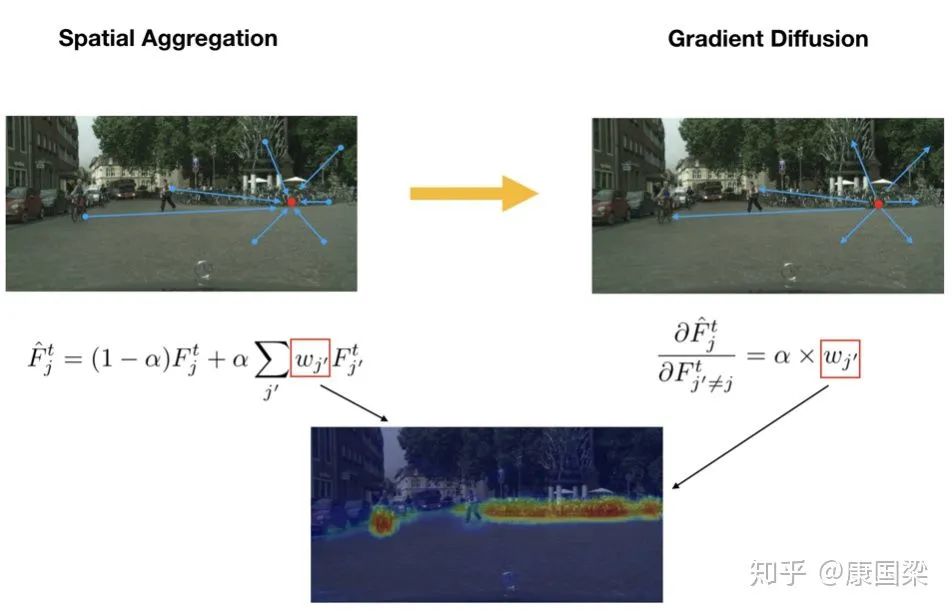 通过循环关联,我们可以建立 source 和 target 像素之间的联系。但是,通常只有部分 target 像素可以和 source 像素成功地建立起关联。原因有两个,一是循环关联倾向于选择最容易关联到的 target 像素;二是由于域差异,对于当前 source 图片的部分像素,target image 中在本质上可能就不存在应该与之关联的像素。为了给更多样化的 target 像素提供 supervision,对每个 target 像素点,我们采取 spatial aggregation 生成新的 feature,然后基于 aggregated feature 建立循环关联,如下图所示。通过这种方式,在 backward 的过程中,每个关联到的 target 像素点作为 seed 把传递给它的 gradients ”分发给“ 图片中的其他像素,其大小取决于其他像素点和 seed 像素点之间的相似度。