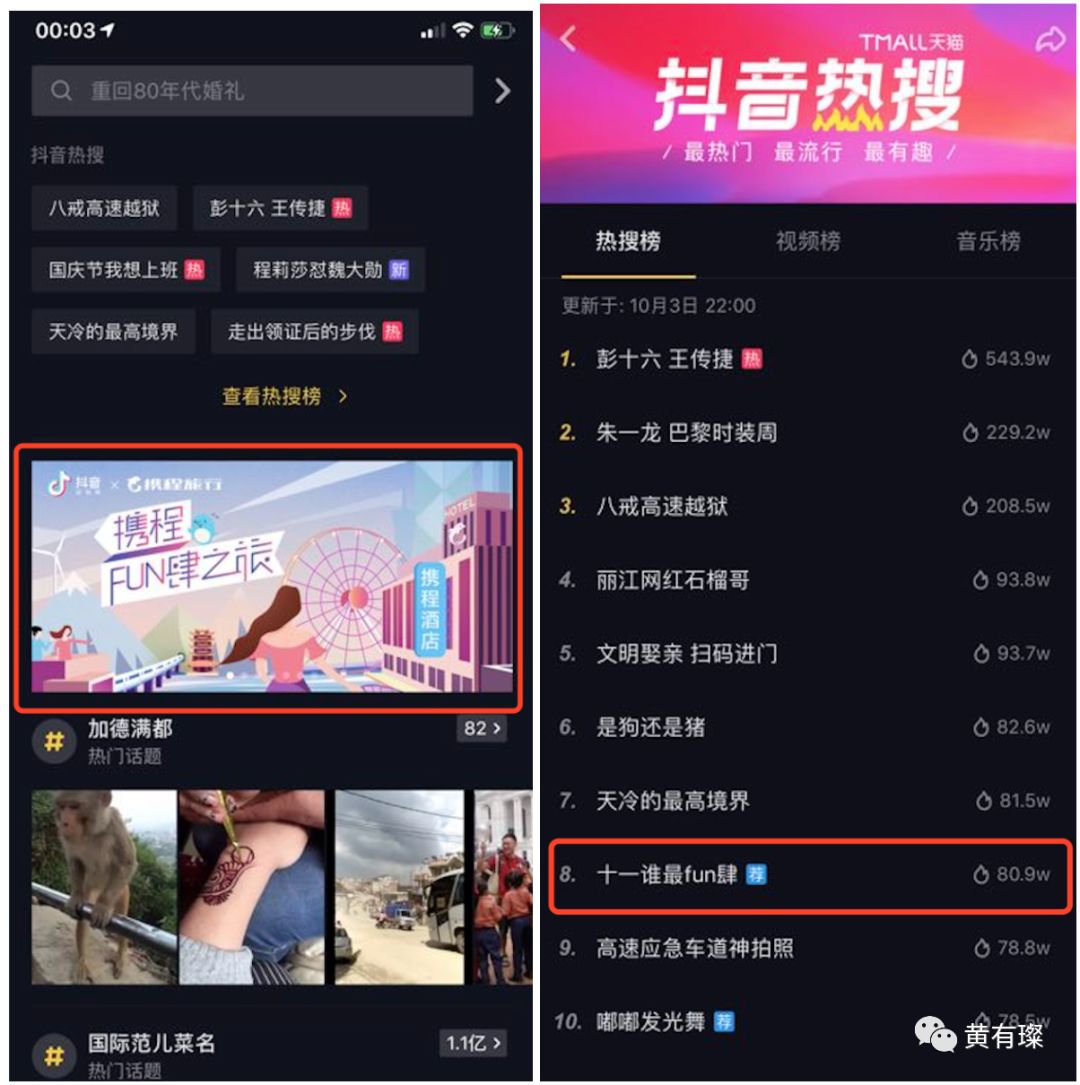 今年的十一黄金周,携程联手抖音一起打造了首个旅行季IP,其中在抖音上发起的#携程fun肆之旅#挑战赛这一重要环节,达成如下成果——