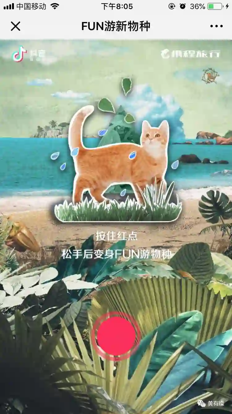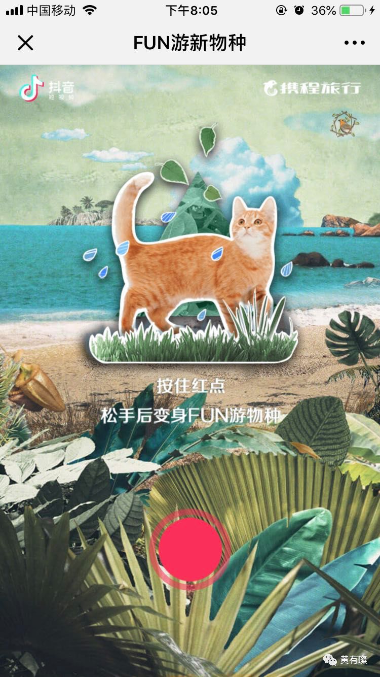 “FUN游新物种“的游戏设计的确有创意,但美中不足的一点是:除了H5里出现的抖音logo,以及视频中出现的人们利用抖音自拍外,即便是在游戏结束后,也丝毫没出现任何引导,告知用户前往抖音,参加携程旅行在抖音发起的#携程fun肆之旅#有奖活动。