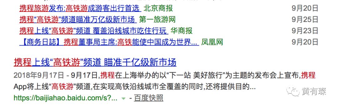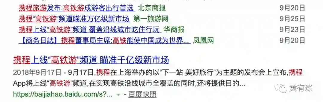 从这个细节中,我们猜想这也许与9月底广深港高铁香港段将正式通车的新闻有关联,而后在查找相关新闻时,出现大量携程在十一前宣布将上线“高铁游”频道新闻,携程希望能把旅行攻略、旅游产品等资源全面整合到一起,无缝解决消费者在目的地的旅游消费需求,从而实现高铁沿线城市全覆盖的目的。