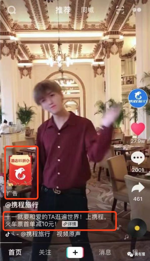 而利用抖音的算法推荐机制,携程制作了红包巧妙地投放在视频中,同时还加入了不同关于“酒店”“火车票”等优惠信息的提示链接,达到进一步刺激用户点击红包及链接的目的,占据用户心智,影响用户形成一致认知,进而引导抖音上的用户跳转至携程App完成消费。
