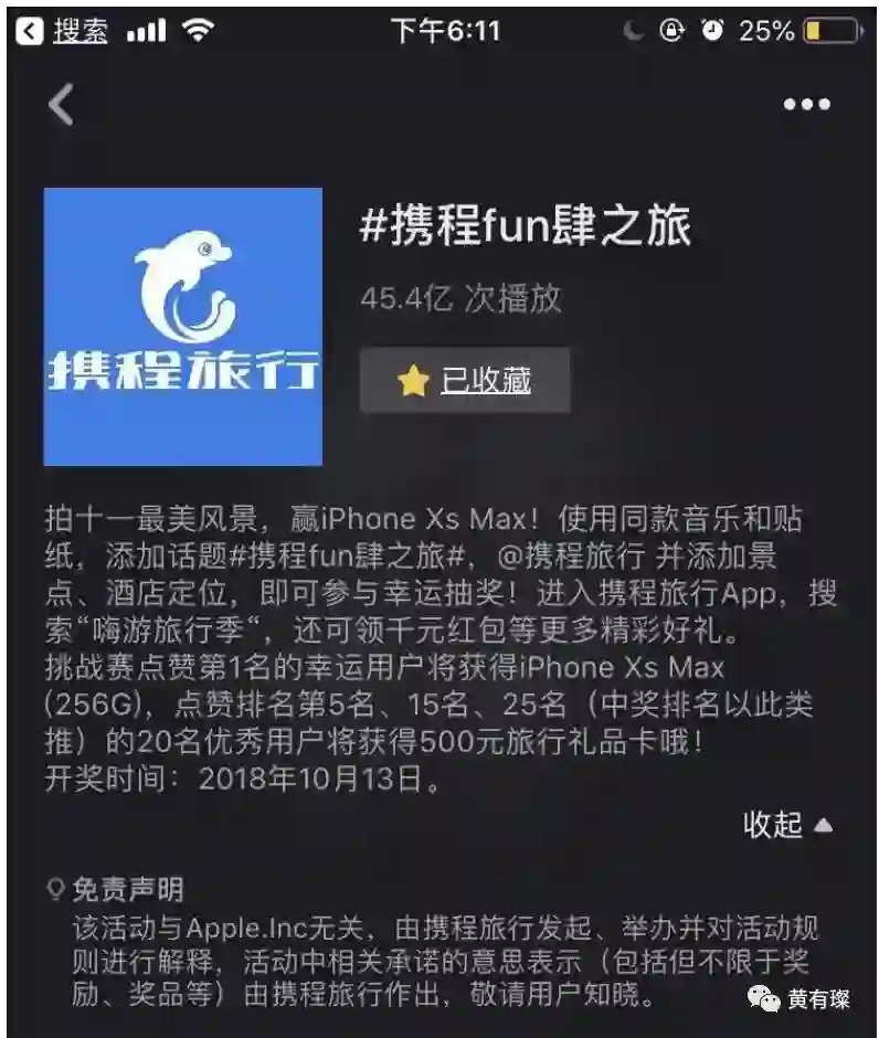 而配合本次挑战赛的活动,携程也抓住年轻人的喜好,设置iPhoneXs Max奖项作为福利,并且将抽奖机制进行了微调整,以“赞数“排名为衡量基准(估计为了防止刷票),将挑战赛推向最后的高潮,也为活动的曝光和参与带来了一定的加持。