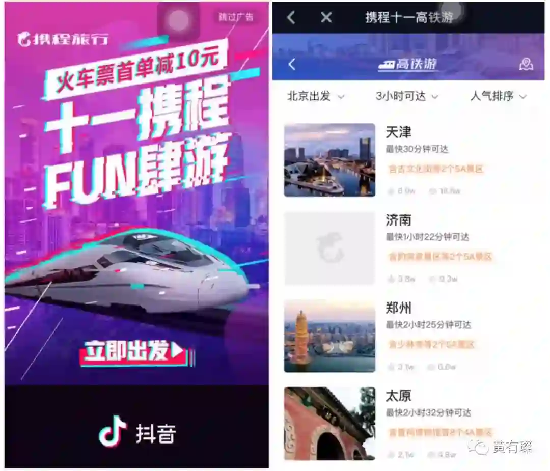 不过分析完这些跳转路径,我们发现似乎本次携程的海报和引导都在倾向于“高铁游”这个概念。除此之外,能明显观察到以抖音KOL@代古拉k为首的相关视频里,出现了大量火车站的镜头画面。