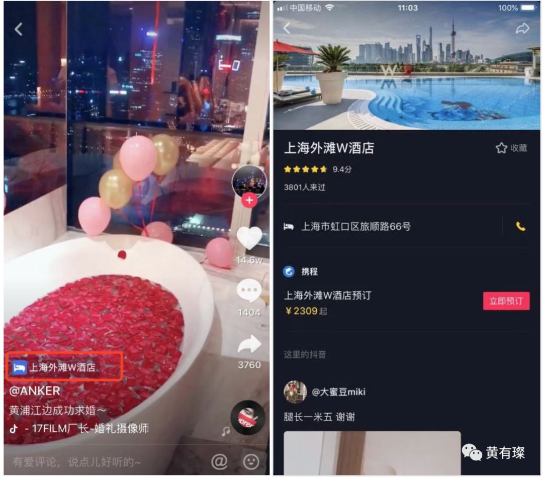 此外,在刷抖音的过程中,我们也发现抖音中提供给用户打卡位置的功能,是可以直接点击的。点击后跳转的界面底部就显示了携程关于该地区的售卖信息。相当于直接打通了用户的消费同路,当用户被抖音视频种草后,可以直接到携程了解和预订。我们猜测携程与抖音的深度合作之后应该会更频繁。