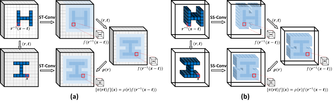 近年来,SE(3) 等变网络在 3D 语义分析任务中发挥着重要的作用,尤以 3D 姿态可控卷积神经网络为代表。3D 姿态可控卷积神经网络利用姿态可控卷积(ST-Conv)逐层学习姿态等变的特征,从而保留 3D 输入的姿态信息。直观地说,对于一个 ST-Conv,关于 3D 输入的任意 SE(3) 变换(r,t),都将诱导输出特征的同步姿态变换,其中r ∈SO(3)表示旋转,表示平移。图 1(a) 进一步给出了解释,给定输入的一个 SE(3) 变换,特征向量所在位置均关于(r,t)进行刚性变换,而特征向量 ρ(r)本身也关于进行旋转(ρ(r)是旋转r的一个表征)。SE(3) 等变的特性激活了特征空间的姿态可控性,例如,SE(3) 变换可通过对特征空间进行操控来直接实现,而无需变换输入。为了生成姿态可控特征,ST-Conv 将特征域限定在 3D 体素数据的规则网格上,使其能通过 3D 卷积方便地实现。对 3D 卷积的兼容简化了 ST-Conv 的实现,但也牺牲了对不规则且稀疏的 3D 数据(例如,点云)的高效处理,导致 ST-Conv 未能在更多 3D 语义分析领域中被广泛使用。