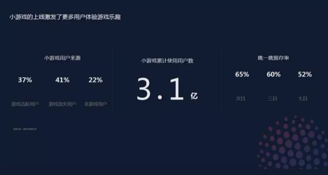 截至目前,小游戏的累计用户达到了 3.1 亿(给个参考指标:微信日活超过 9 亿)。孙春光表示: 2017 年移动游戏的自然人有 4 亿多,我们用 20 天就达到了这样一个数据。