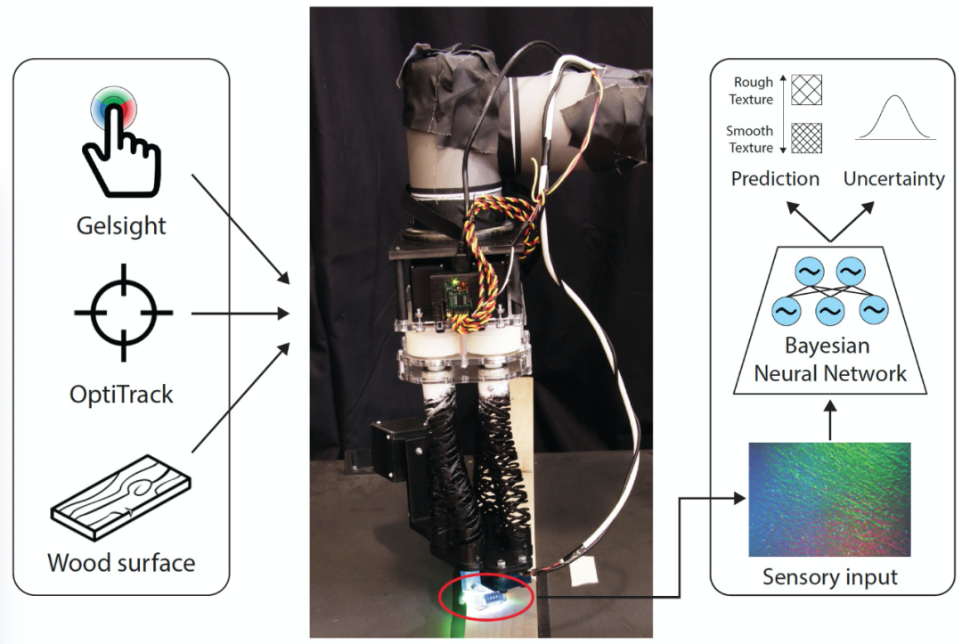 图 1. 大面积纹理预测。本文系统利用 Gelsight 光学触控感测来学习表面纹理的复杂表示,并通过认知不确定性建模,该算法可以提供反馈以通知自动化机器人打磨模块