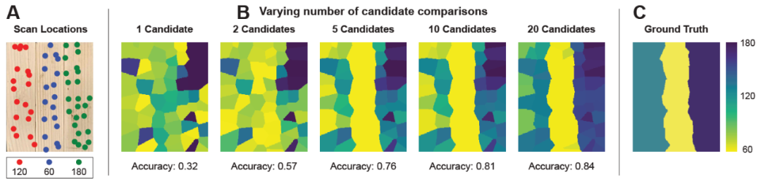 图 5A 显示了使用本文系统的 Gelsight 扫描的测试板和空间位置。每个点的颜色代表扫描位置的地面真实砂砾。使用具有不确定性感知权重的绝对分类器可以达到 85.3% 的纹理分类准确率。对于相对纹理分类,在每个扫描位置输入该位置的当前扫描以及已知砂砾的 “候选” 基线子块。这个候选子块可以直接从训练库中获取,也可以从一个单独的带标注的候选数据库中获取。模型能够预测当前扫描(未知砂砾)和另一个已知砂砾候选扫描之间的砂砾度。对比不同砂砾级别的几个候选数据,可以预测当前扫描的砂砾。图 5B 给出了添加更多候选样本的可视化效果,同时继续利用不确定性加权算法过滤出扫描的高不确定性区域。基于空间距离最近的扫描预测,通过对区域进行空间着色来生成可视化热图。预测的准确度是根据真实砂砾分类计算得到的(图 5C)。