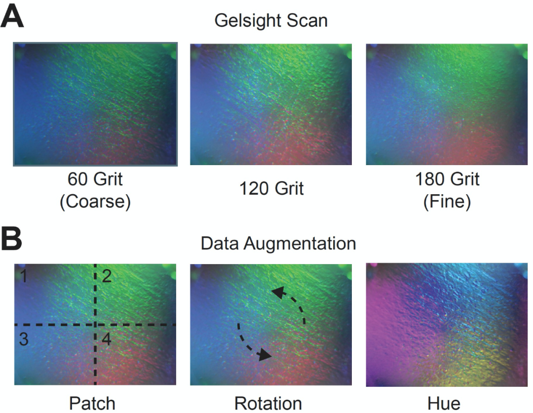 图 2. 样本数据和增强数据样本。随机抽样扫描(A)三种不同的表面材料,从粗(左)到细(右)。(B)为实现平移、旋转和色调不变性,增强处理后的数据样本