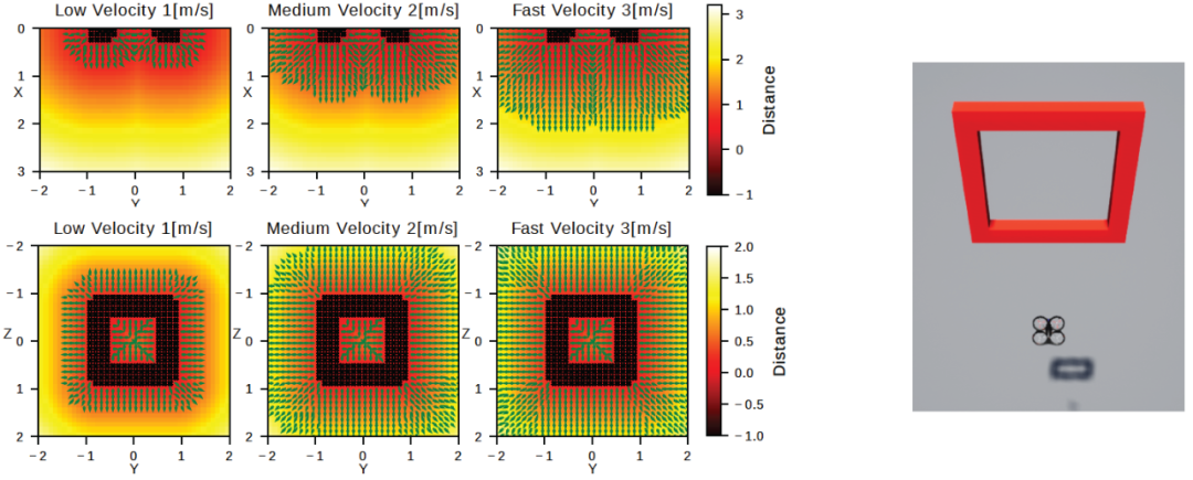 对于无人机竞赛中的应用,目标是将方形门视为障碍物(见图 14)。另外,考虑到公式(2)中的有限边界和我们所有的障碍物都是相同的,本文使用公式(2)对机器人在感兴趣区域内相对于门的一组采样姿势预计算符号距离场,从而创建一个距离地图。