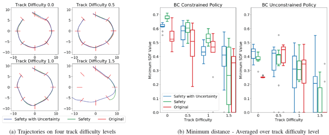 图 16. (a) 原始策略和安全策略的实验轨迹样本。(b) 箱线图总结了在 10 次实验中,每种难度水平下四旋翼机到达任何门的最近距离。水平线表示中间值,而方框的边界分别表示 25% 和 75% 分位数水平