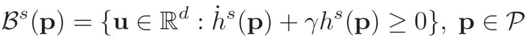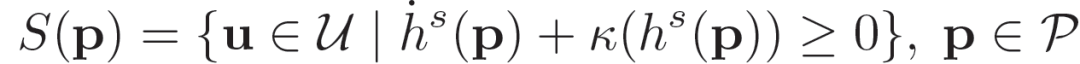 基于零控制屏障函数(Zeroing Control Barrier Functions,ZCBF)和 SBC 理论,控制器 u 需要满足一定的条件以保证安全集的前向不变性(Forward invariance)。令连续可微函数 h^s 表示一个 ZCBF,容许控制空间可定义为: