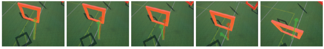 图 17. 四旋翼机正在向门移动的可视化图示。图片按照四旋翼机的运动从左到右排列。在每个图中,红色箭头表示原始的深度策略控制,绿色箭头表示本文框架推断的安全操作,本文框架同时考虑到了门位置的不确定性