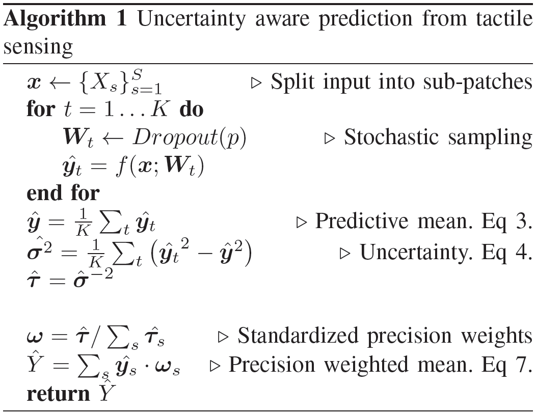 通过上述处理步骤,可以将不确定性估计与预测相融合,从而实现不确定性感知推理。这在软机器人领域中是极其重要的。在实际部署过程中,由于软机器人的传感器未完全按下,或者传感器的一部分离开目标兴趣区域等原因,不确定性感知推理系统的扫描结果会遇到较为严重的噪声问题。为了解决这一问题,作者引入一种在潜在噪声触觉扫描中获得可靠预测的算法,该算法基于每个子部分的不确定性将扫描子部分的预测组合起来。