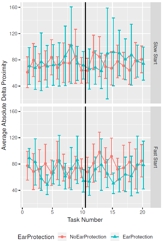 H2:机器人手臂移动速度的变化以及参与者是否佩戴了护耳装置,对参与者的运动的影响。