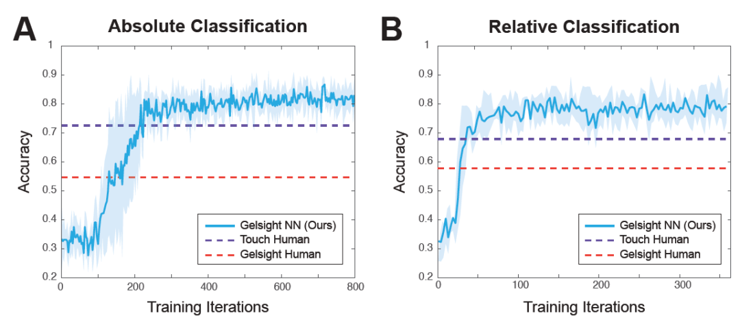 图 4 给出了本文提出的训练算法在绝对(A)和相对(B)纹理分类任务上的损失演化曲线。标准偏差蓝线表示实验结果的平均值。这些曲线显示的是验证集在看不见的 Gelsight 扫描上的准确度,而不在是以前看到的训练数据中的。为了进一步进行比较,作者还用触觉(紫色)和视觉 Gelsight 感知(橙色)来绘制性能水平线,以确定人类在这两项任务中的准确性。