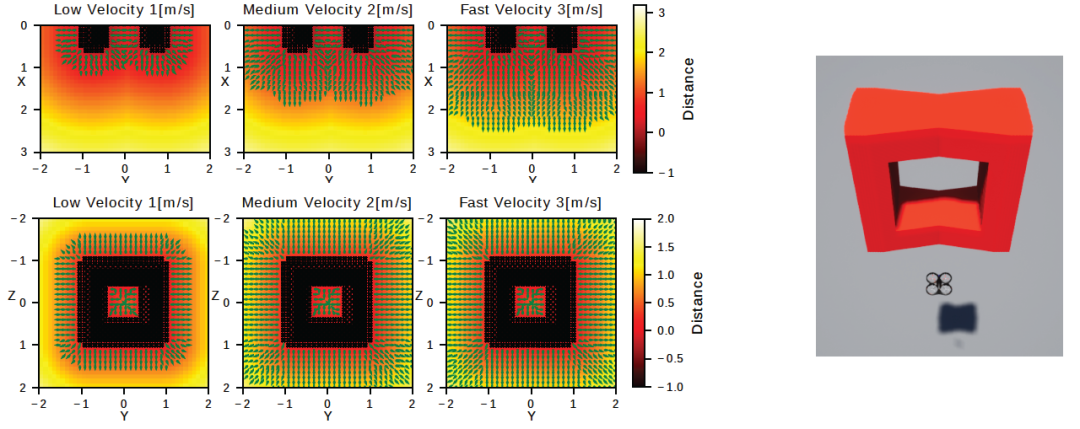 图 14. 由公式(2)、XY 和 YZ 平面(上排和下排)定义的距离地图。绿色箭头指示 SBC 计算的最安全动作,并提供安全约束,黑色十字表示各个方向不安全的位置。每个位置和每个角度的采样动作为 | u|=velocity。右图为原来的大门。