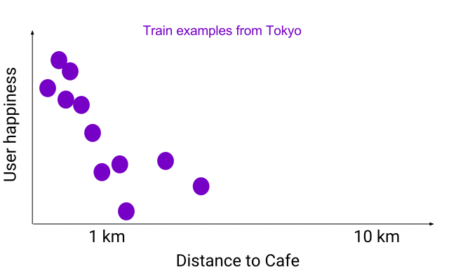 下图中我们展示了一个灵活的模型(粉色曲线),它可以精确地与来自东京用户的训练数据(紫色圆点)相匹配,在用户附近有很多咖啡店。
