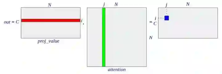 然后,再把 proj_value (C × N)矩阵同 attention 矩阵的转置(N × N)相乘,得到 out (C × N)。之所以转置,是因为 attention 中每行的和为 1,其意义是权重,需要转置后变为每列的和为 1,施加于 proj_value 的行上,作为该行的加权平均。 proj_value 第 i 行代表第 i 个通道所有的像素值, attention 第 j 列,代表所有像素施加到第 j 个像素的影响。