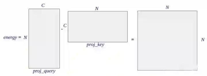 若 batch size=1,就是普通的矩阵乘法。已知 proj_query 维度是 N × C, proj_key 的维度是 C × N,因此 energy 的维度是 N × N: