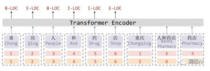 因此,我们可以将Lattice结构展平,将其从一个有向无环图展平为一个平面的Flat-Lattice Transformer结构,由多个span构成:每个字符的head和tail是相同的,每个词汇的head和tail是skipped的。