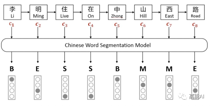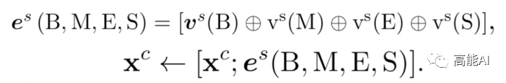 很容易理解,上述公式则将BMES对应的词汇编码与字符编码进行拼接,其计算方式为: