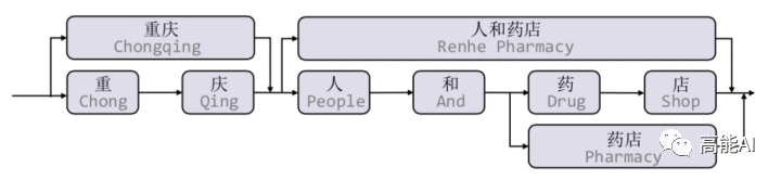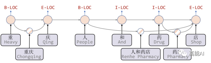 信息损失:1)每个字符只能获取以它为结尾的词汇信息,对于其之前的词汇信息也没有持续记忆。如对于「药」,并无法获得‘inside’的「人和药店」信息。2)由于RNN特性,采取BiLSTM时其前向和后向的词汇信息不能共享。