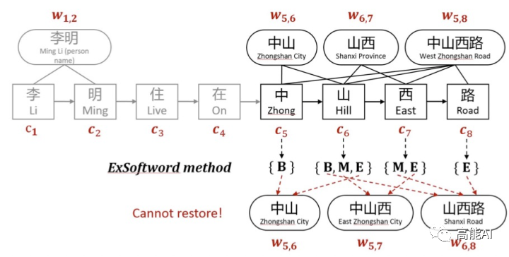 也会造成信息损失,无法恢复词汇匹配结果,例如,假设有两个词汇列表[中山,山西,中山西路]和[中山,中山西,山西路],按照ExtendSoftword方式,两个词汇列表对应字符匹配结果是一致的;换句话说,当前ExtendSoftword匹配结果无法复原原始的词汇信息是怎样的,从而导致信息损失。