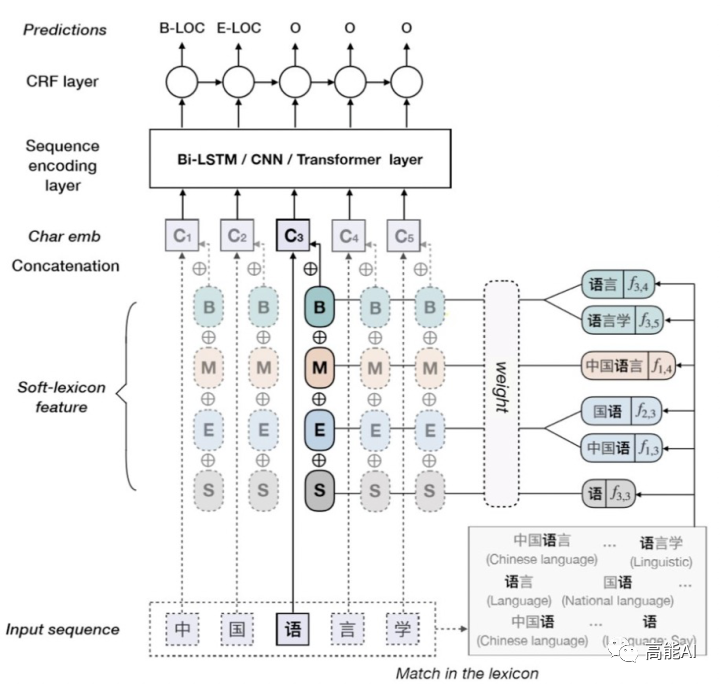 由上图可以看出,对于字符[语],其标签B对应的词汇集合涵盖[语言,语言学];标签M对应[中国语言];标签E对应[国语、中国语];标签S对应[语]。当前字符引入词汇信息后的特征表示为: