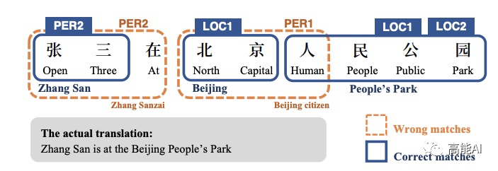 虽然引入实体词典等有关知识信息对NER性能可能会有所帮助,但实体词典可能会包含不相关甚至错误的信息,这会损害系统的性能。如上图所示,利用4个实体词典:「PER1」、「PER2」、「LOC1」、「LOC2」进行匹配,错误实体就有2个。