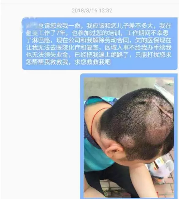 “你知道对于一个癌症病人,社保停缴意味着什么吗?”4月以后,实质上已经被星美裁掉的王硕,没有经济来源,这期间进行了几次化疗,自费数万。“我干了那么多年,一个月工资也就5000块,没多少积蓄可以自费治大病的。”经过多方打听,王硕在8月中旬联系到了星美实控人覃辉,发短信描述了自己的困难,问能否补交社保。覃辉回他:“好。”
