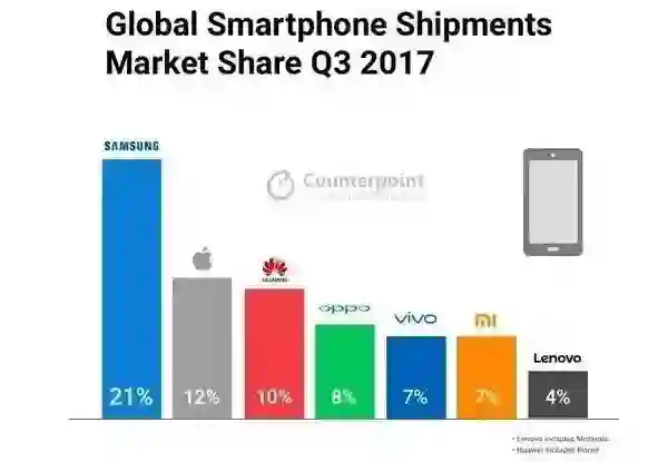 中国手机市场中前五分别是华为、OPPO、vivo、小米、苹果。三星已经挤出前五,苹果也已退居第五。