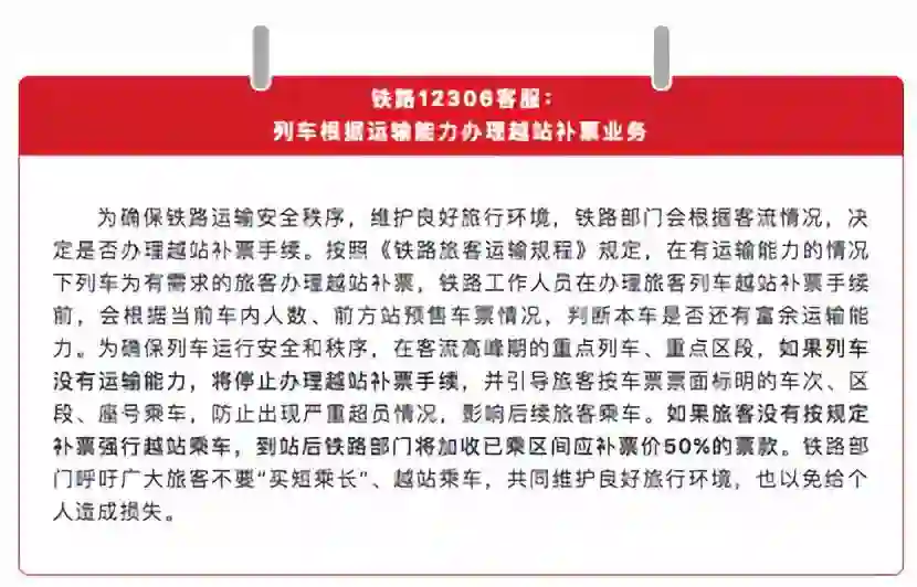 铁路部门呼吁广大旅客不要“买短乘长”、越站乘车,共同维护良好旅行环境,也以免给个人造成损失。