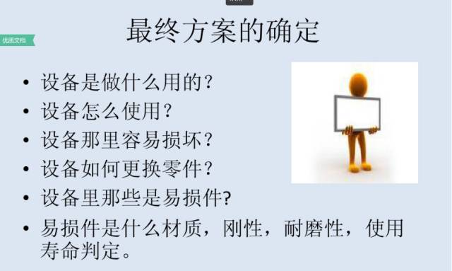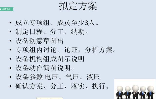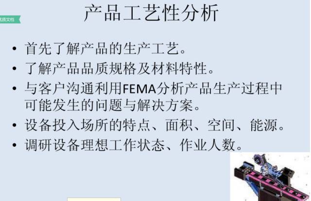 1、收集信息:详细了解原有工序、生产工艺或生产设备的所有具体细节,和现有产能、人工数量、现有多少工序、工序品质(或产品品质)、原辅材料等情况。最好能到生产线上去向主管工程师和操作员工进行多层面的询问、勘察和了解,并了解工作场地中的环境要求,以及是否有什么特殊的要求;
