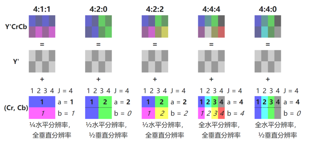 YUV 色彩的诞生很大程度上是和曾经的黑白电视机有关,工程师们想要在兼容黑白电视的基础上添加颜色,而恰好由于人眼的特性:比起颜色的色相和饱和度,人眼会对亮度更加敏感,而且 Y 代表的亮度值也可以直接由黑白电视所呈现。 而 U、V 这样的色差信号可以让设备以一种牺牲颜色或让特定颜色产生一定位移的代价,让另外一种颜色更饱和。U、V 的绝对值越高,颜色越饱和;越趋近于零,颜色越灰。 此外通过 YUV 色彩编码和人眼对颜色不敏感的特点,我们可以有选择的抽走一部分颜色,进而可以有效节约带宽,这就是抽样系统。色度抽样一般都会采用 J:a:b 这样的三分比值表示: