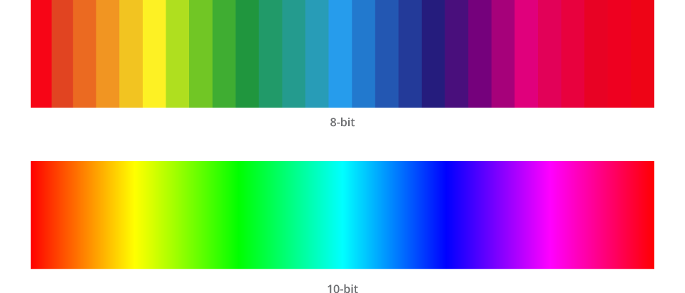 这里的「位/bit」又是什么意思?我们不妨拿 8bit 的 RGB 色彩空间来更深入地展开解释色彩空间。 在 8bit 的 RGB 色彩空间中,R、G、B 每个元素都有 8 位数字,每位数字都是二进制(0 和 1)。但是我们日常生活里更常用的是十进制,将 8 位二进制所有可能取到的值转换为十进制后,我们可以给 R、G、B 赋值的十进制范围就变成了整数范围的 0~255,也就是 2^8=256 个值,总计 16,777,216 种颜色。 而 10bit 的 RGB 色彩空间中,R、G、B 每个元素都有 10 位数字,每位数字都是二进制(0 和 1)。但是我们日常生活里更常用的是十进制,将 10 位二进制所有可能取到的值转换为十进制后,我们可以给 R、G、B 赋值的十进制范围就变成了整数范围的 0~1023,也就是 2^10=1024 个值,总计 1,073,741,824 种颜色。