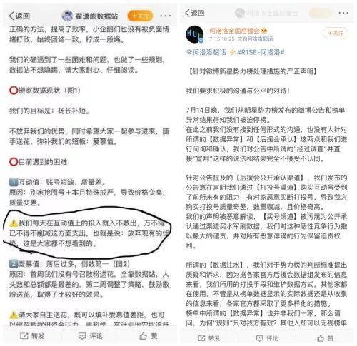何洛洛全国后援会则在声明中称,对于“数据异常”和“后援会承认刷榜”,微博方面未与其问询及确认,何洛洛全国后援会对微博明星势力榜的前述声明完全不接受、不认同。