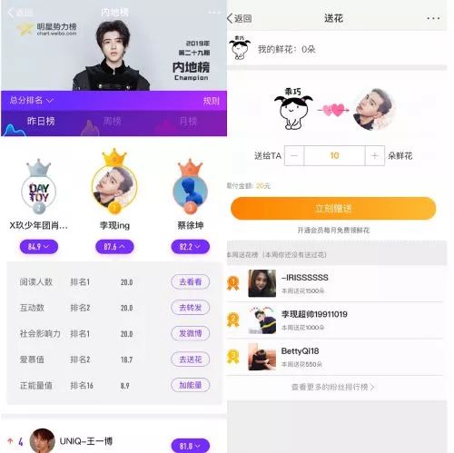 而爱慕值是指粉丝对明星的贡献度,需要粉丝进行真金白银的投入。具体来说,就是送花给明星贡献爱慕值,一朵花可以贡献两个爱慕值,每朵鲜花2元,开通微博会员可以免费领1朵或3朵鲜花。以登顶内地榜的李现为例,本周有粉丝已经为其送了1500朵鲜花,花费3000元。
