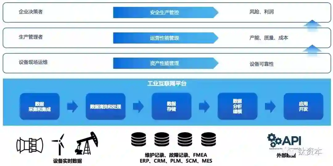 高端制造的工业互联网应用非常离散化,应用场景主要是三类,设备资产管理、运营性能管理和生产经营决策。资产性能管理的目标是提高资产(也就是设备)的可靠性,避免非计划停机;只有保证了设备的可靠性,才能保证运营过程中的产能、质量、成本的有效提升,才能优化运营指标;而只有保证了运营效率的提升,才能实现企业经营利润的提升和经营风险的规避,所以这三层是通过数据的价值环环相扣的。