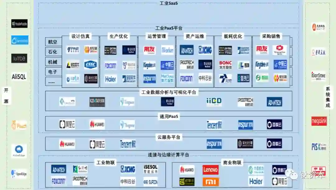 工业互联网厂商非常多,从最基本的连接端到云服务端,从IaaS端到PaaS端再到工业数据分析展示和可视化平台再到具体应用场景,设计仿真、生产优化、运营管理、资产运维、能耗管理、采购优化等,都是在工业里利用物联网的数据采集和大数据分析后才能创造出的应用场景。