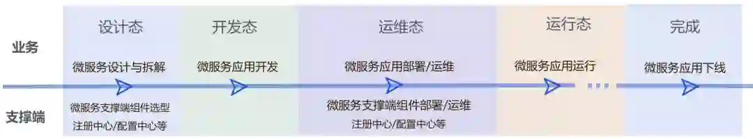 在了解过微服务的落地路径后,我们再来看看如何高效、快速地落地微服务。基于分层设计的思想,可以将微服务生命周期中的几个阶段统一划分为两层:业务层和支撑端层,将业务逻辑与技术相互隔离,各层分别高效构建,相互协作。