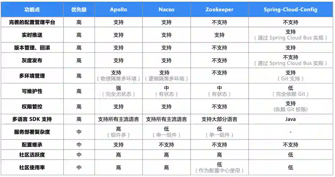 Apollo、Nacos 为目前国内主流的配置中心产品,功能完善、社区活跃度高,由于 Apollo 只包含配置中心能力,Nacos 既包含配置中心又包含注册中心能力,所以仅对比配置中心,Apollo 整体产品能力强于 Nacos,但整体复杂度略高于 Nacos。Zookeeper/Consul 只包含核心的推送数据能力,需要针对配置中心场景二次封装,例如较早开源的产品 disconf(已停止维护)。所以不建议裸用 Zookeeper/Consul 作为配置中心。Spring Cloud Config 是 Spring Cloud 中动态配置解决方案,仅适用于 Java 生态,且由于使用成本高,在国内使用度低。