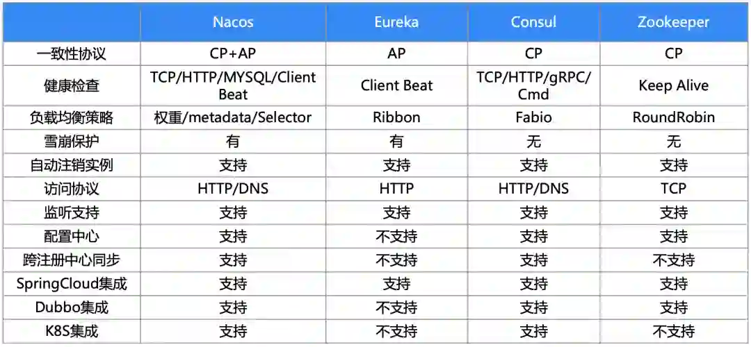 在微服务架构中,支撑端组件的选型也非常重要。其中,注册中心是最核心的基础服务之一,注册中心可以看做是微服务架构里的通信中心,当一个服务去请求另一个服务时,通过注册中心可以获取该服务的状态、地址等核心信息,因此,注册中心的数据一致性和高可用的能力非常重要,下面是业内主流注册中心的对比: